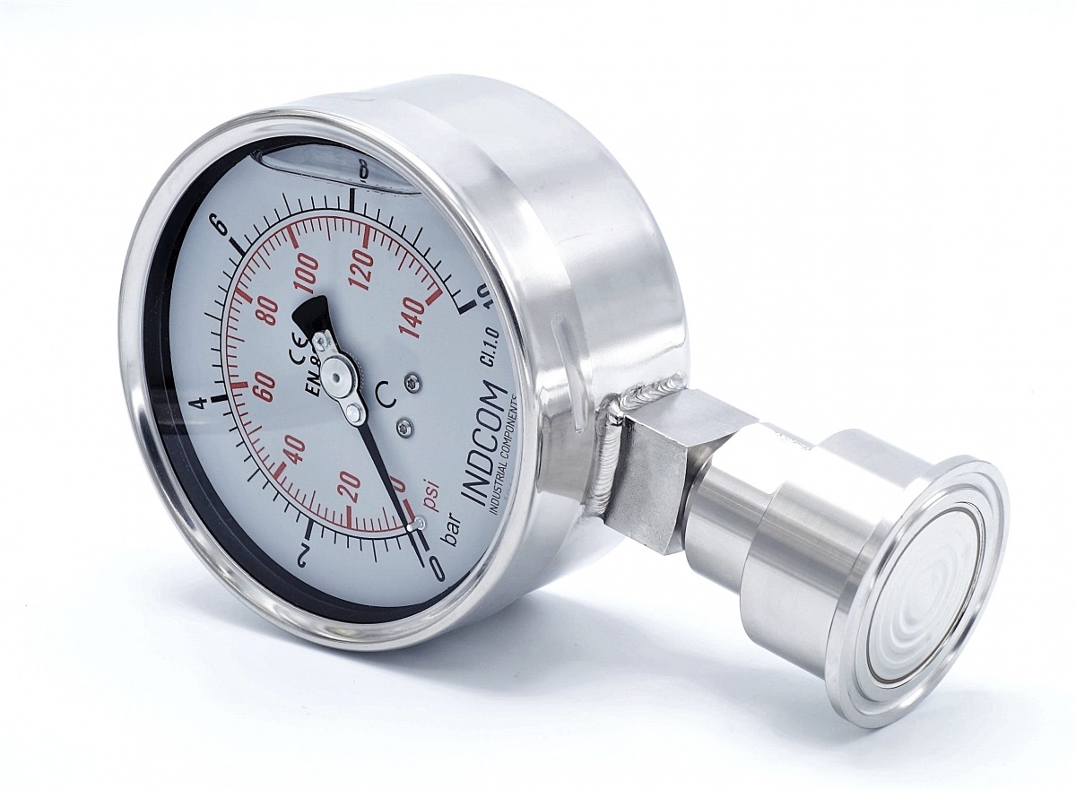 Celonerezový tlakoměr, číselník 100 mm, s oddělovací membránou CLAMP DIN32676 - límeček 50.5 mm
