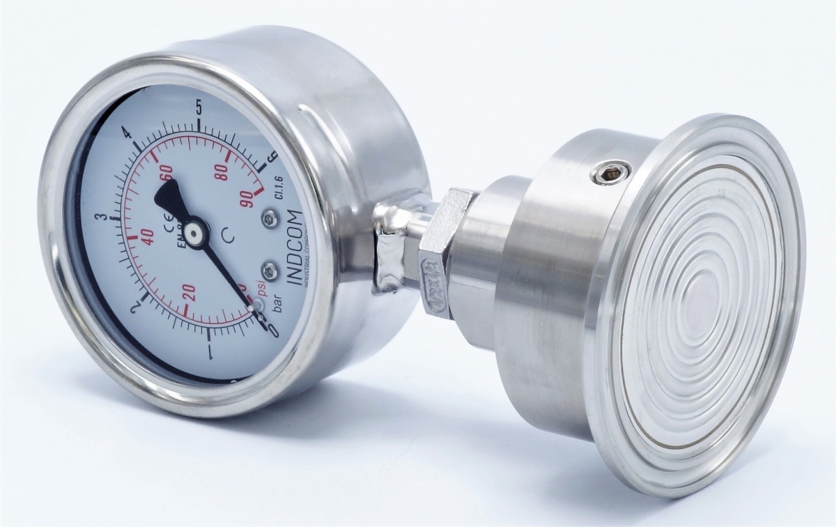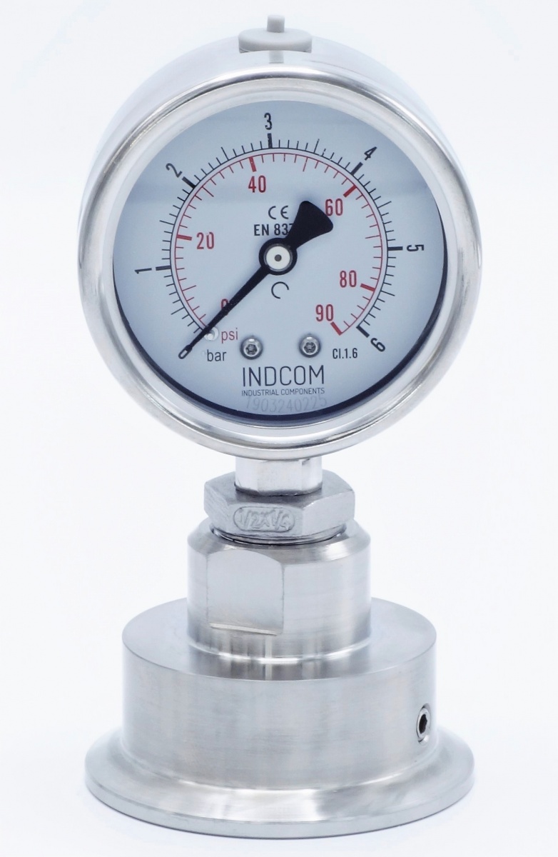 Celonerezový tlakoměr, číselník 63 mm, s oddělovací membránou-CLAMP DIN 32676, límeček 64 mm