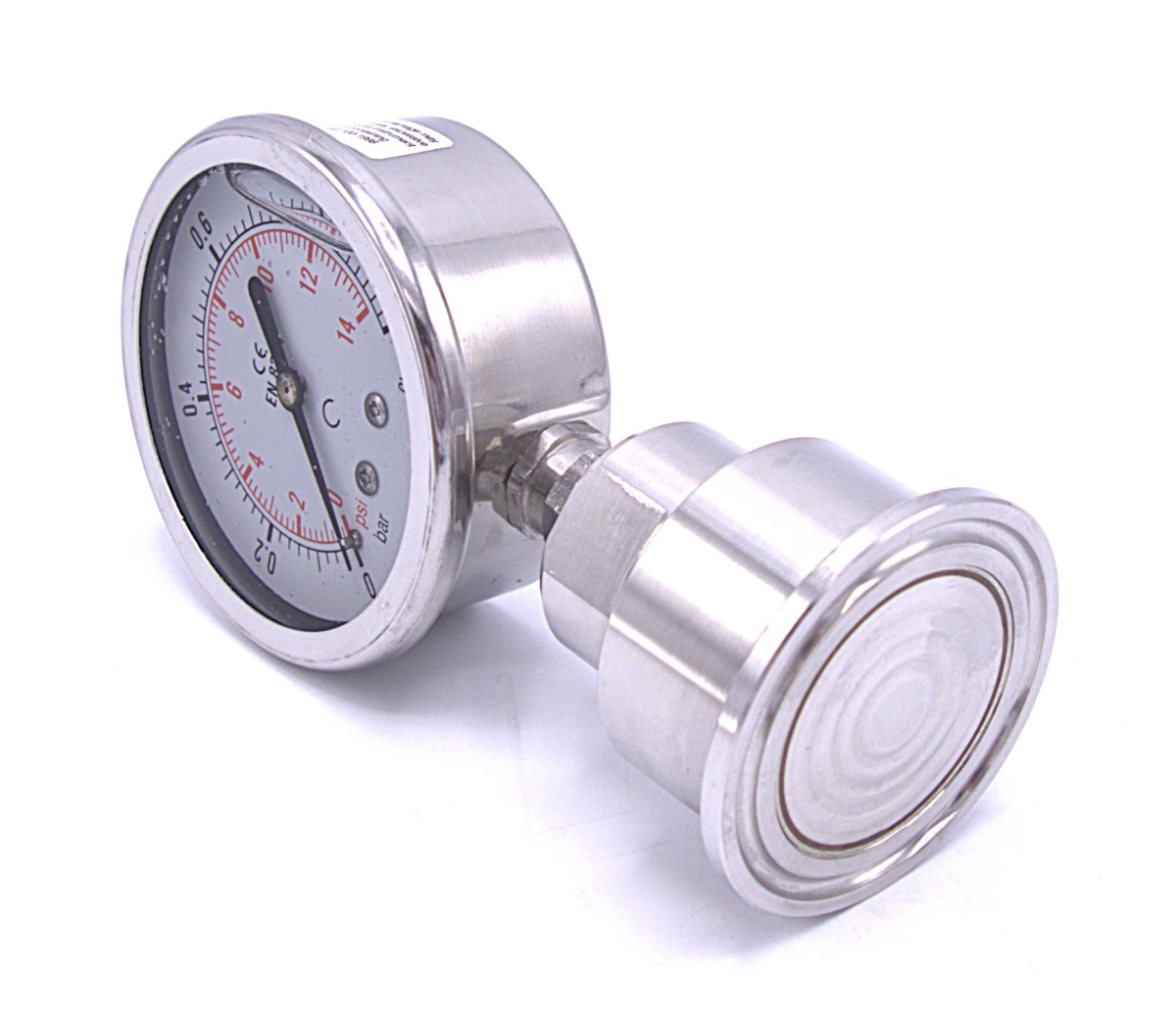 Celonerezový tlakoměr, číselník 63 mm, s oddělovací membránou-CLAMP DIN 32676, límeček 50.5 mm