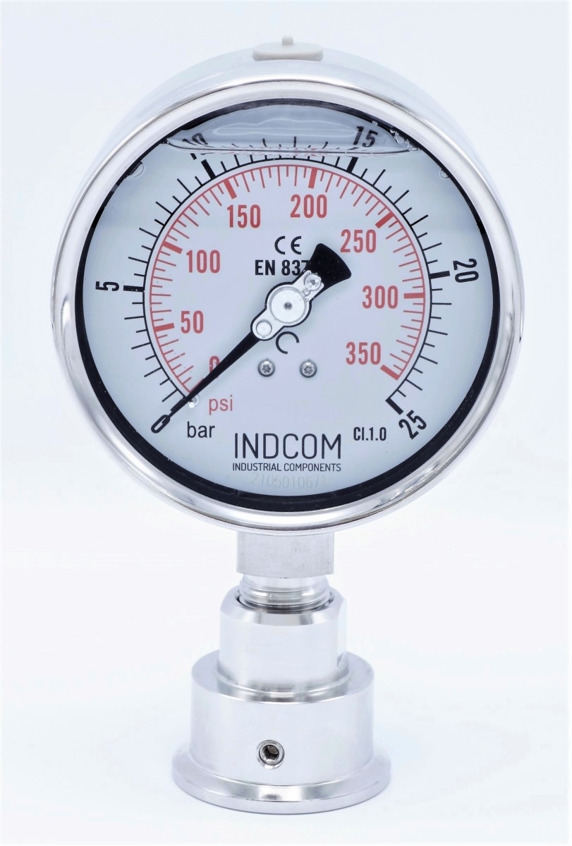 Celonerezový tlakoměr 100 mm s oddělovací membránou CLAMP DIN 32676 (50.5 mm), DN 40 (límeček 50.5 mm)