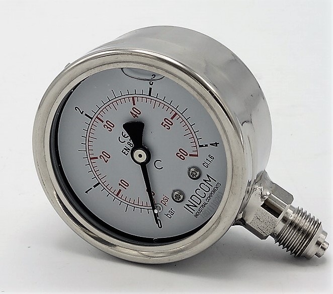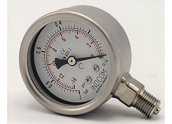 - Je vyroben z nerezové oceli: materiál pouzdra AISI 304, materiál závitu AISI 316. Snímacím zařízení je Bourdonova nerezová pružina.