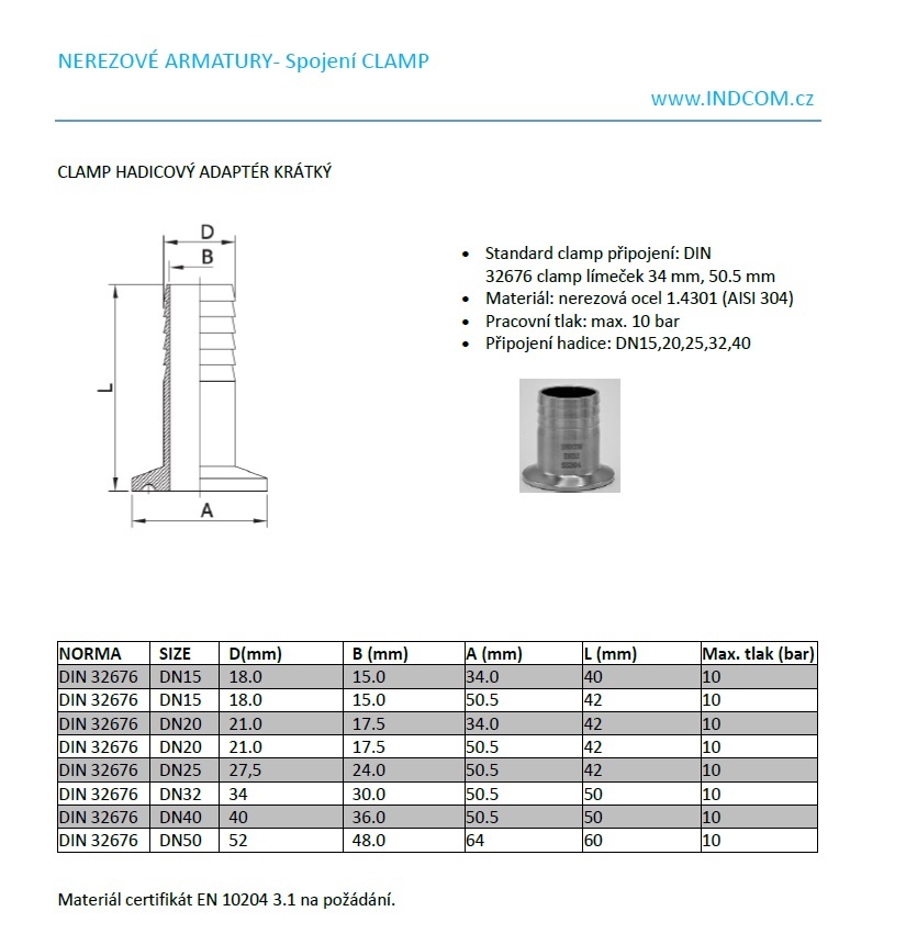 | Standard clamp připojení | DIN 32676 clamp límeček 34 mm, 50.5 mm, 64 mm |