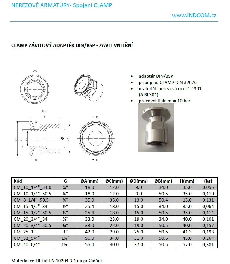CLAMP závitový adaptér, závit vnitřní (mufna)
