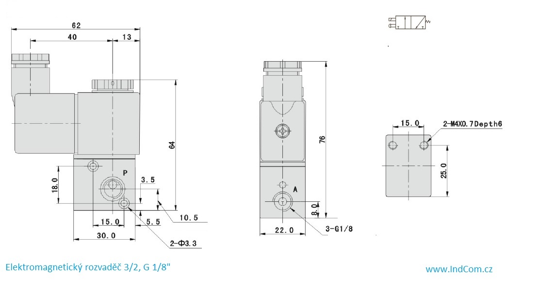 Elektromagnetický rozvaděč 3/2, G 1/8", DC24V
