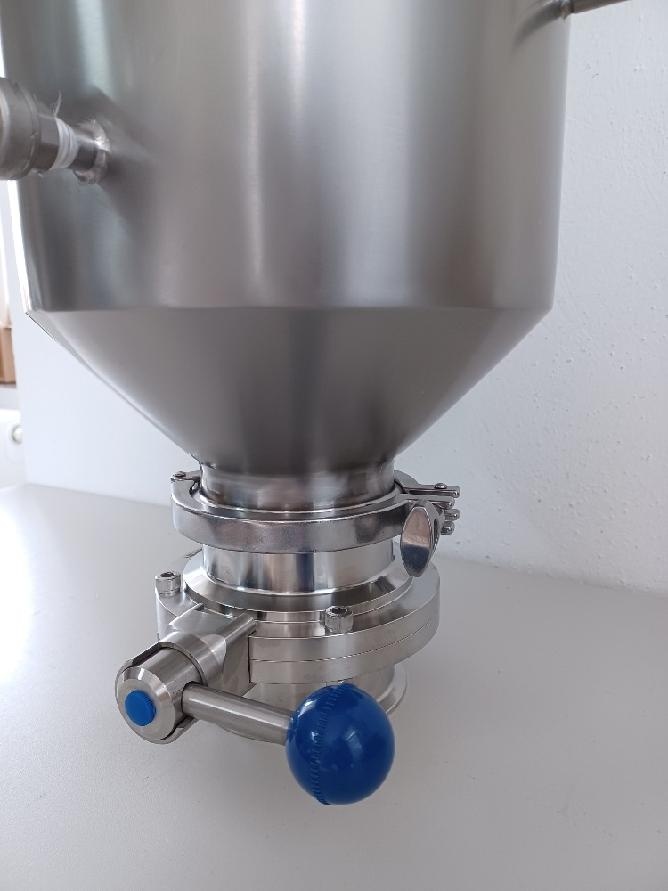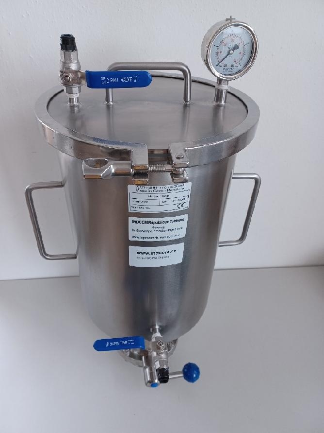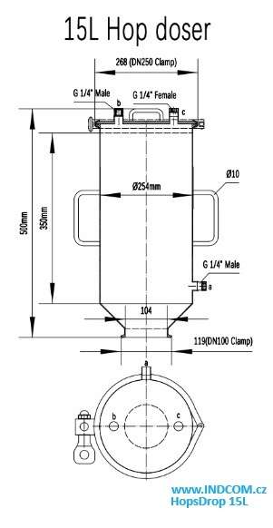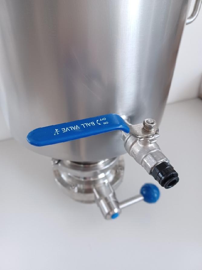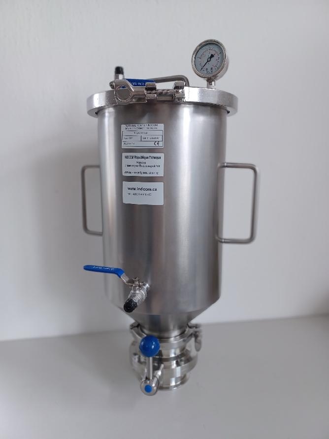 HopsDrop se obecně skládá z přímé klapky DN 100, která je upevněna na fermentoru (lze upravit podle vašeho připojení na fermentoru). Dále má HopsDrop dole 1/4" BSP ventil pro přívod CO2, který tlačí kyslík do 1/4" BSP ventilu nahoře na víku. Na krytu je také instalován manometr 0-4Bar.