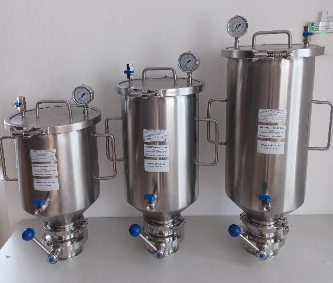 Nádoba pro studené chmelení, k připojení na horní klenuté dno tanku a pro dávkování granulovaného chmele při vyrovnání tlaku.