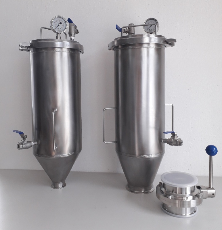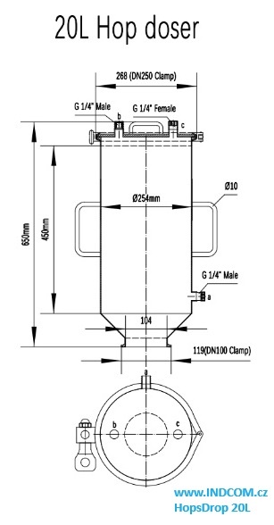 HopsDrop se obecně skládá z přímé klapky DN 100, která je upevněna na fermentoru (lze upravit podle vašeho připojení na fermentoru). Dále má HopsDrop dole 1/4" BSP ventil pro přívod CO2, který tlačí kyslík do 1/4" BSP ventilu nahoře na víku. Na krytu je také instalován manometr 0-4Bar.