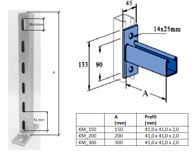 Konzola je vyrobena z galvanicky pozinkované oceli. Robusní provedení. Montážní lišta o profilu U 41 x 41 mm, navařená na kotevní desce pro přímou montáž na zeď.
