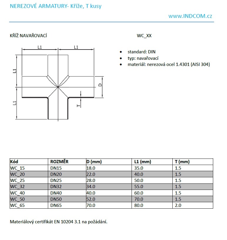 Kód | ROZMĚR | D (mm) | L1 (mm) | T (mm) |