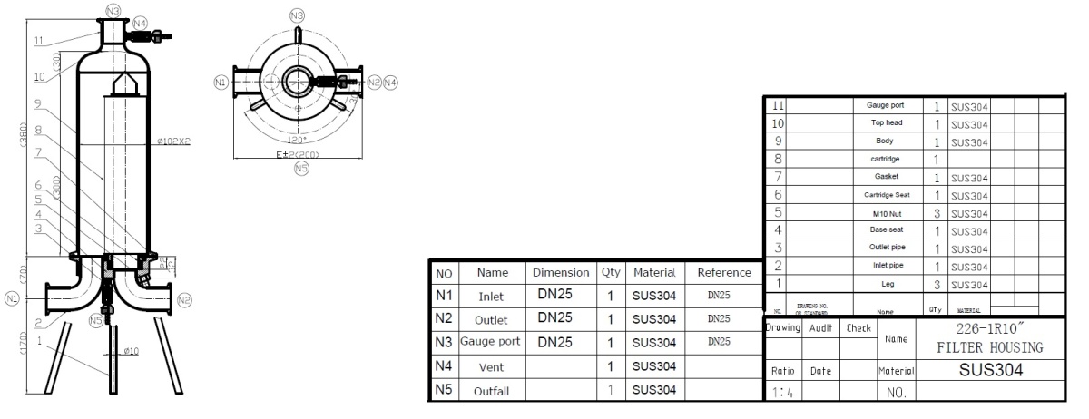 Tělo filtru je určeno k přímému kontaktu s filtrovaným produktem. Svíčka je připojena do filtračního housingu pomocí zámku (označený O-226). Připojení filtračních housingů do systému několika stupňové filtrace pomocí DIN CLAMP spoje.