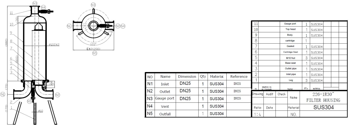 Tělo filtru je určeno k přímému kontaktu s filtrovaným produktem. Svíčka je připojena do filtračního housingu pomocí zámku (označený O-226). Připojení filtračních housingů do systému několika stupňové filtrace pomocí DIN CLAMP spoje.