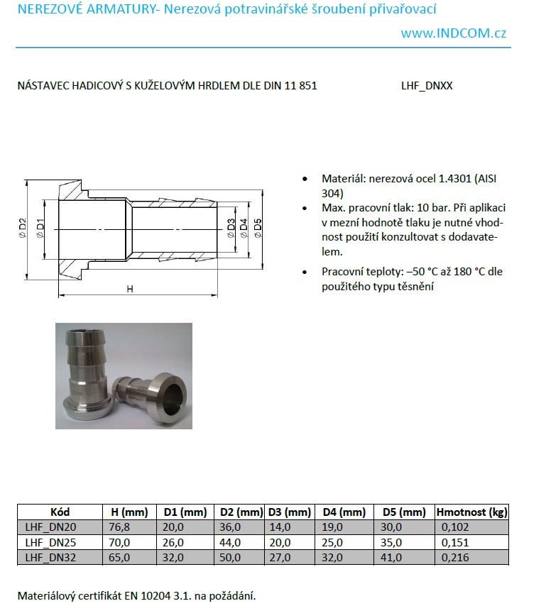 Nástavec hadicový s kuželovým hrdlem DIN 11851