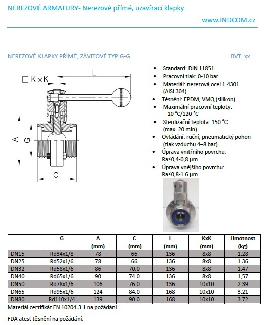Nerezové klapky přímé, potravinářské/mlékárenské šroubení typ G-G
