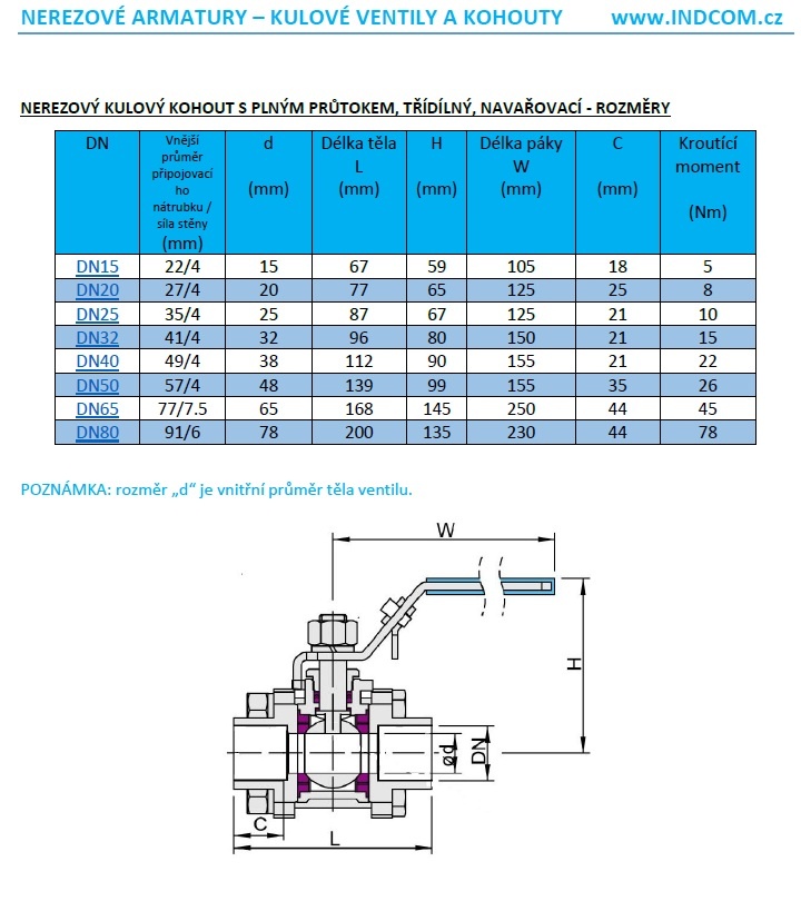 - konstrukce: 3-dílný (tělo a dvě koncovky spojeny svorníkovými šrouby) nátrubkový kulový kohout s plným průtokem