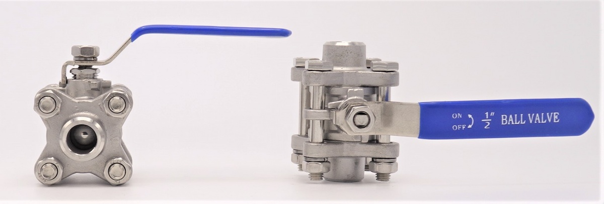 Konstrukce3-dílný (tělo a dvě koncovky spojeny svorníkovými šrouby) nátrubkový kulový kohout s plným průtokem