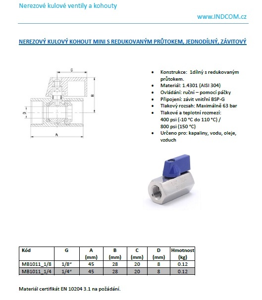 Nerezový kulový kohout MINI s redukovaným průtokem, jednodílný, závitový