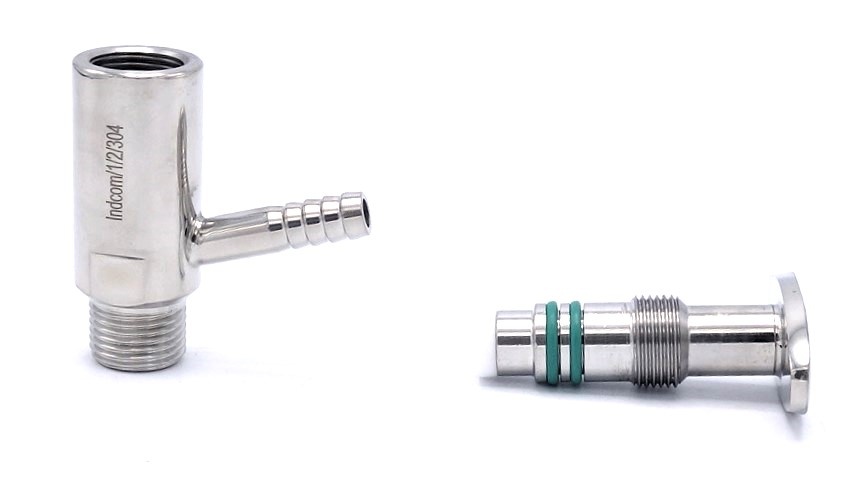 | Materiál | hlava ventilu nerezová ocel 1.4301 (AISI 304), tělo ventilu nerezová ocel 1.4301 (AISI 304), zelené O-kroužky materiál silikon, teflon těsnění kuželu |