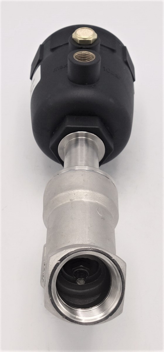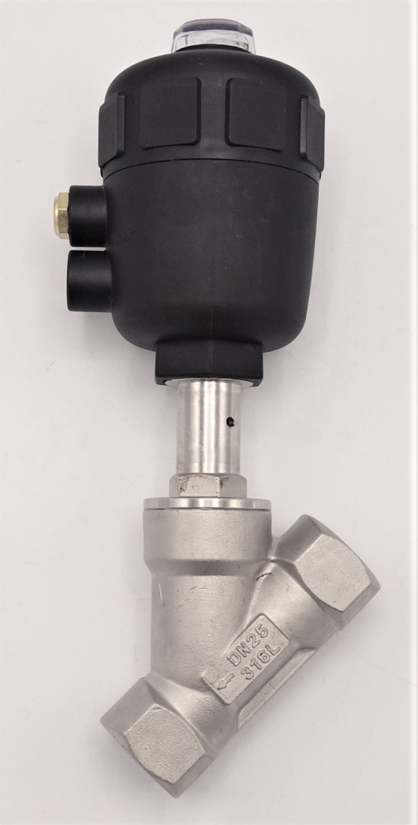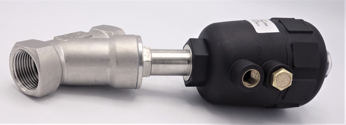 Pneumaticky ovládaný ventil se šikmým sedlem-45°, G-závit, materiál těsnění PTFE