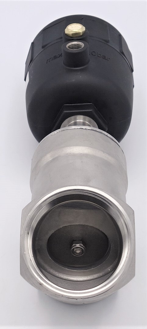 Pneumaticky ovládaný ventil se šikmým sedlem-45°, G-závit, materiál těsnění PTFE