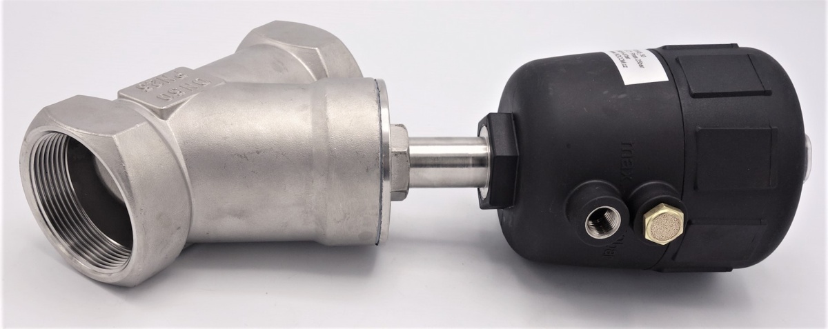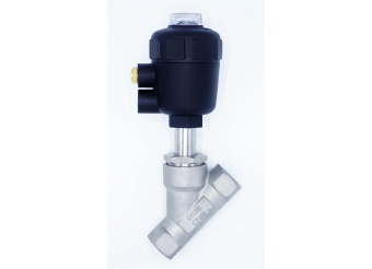 Pneumaticky ovládaný ventil se šikmým sedlem-45°, G-závit, materiál těsnění PTFE