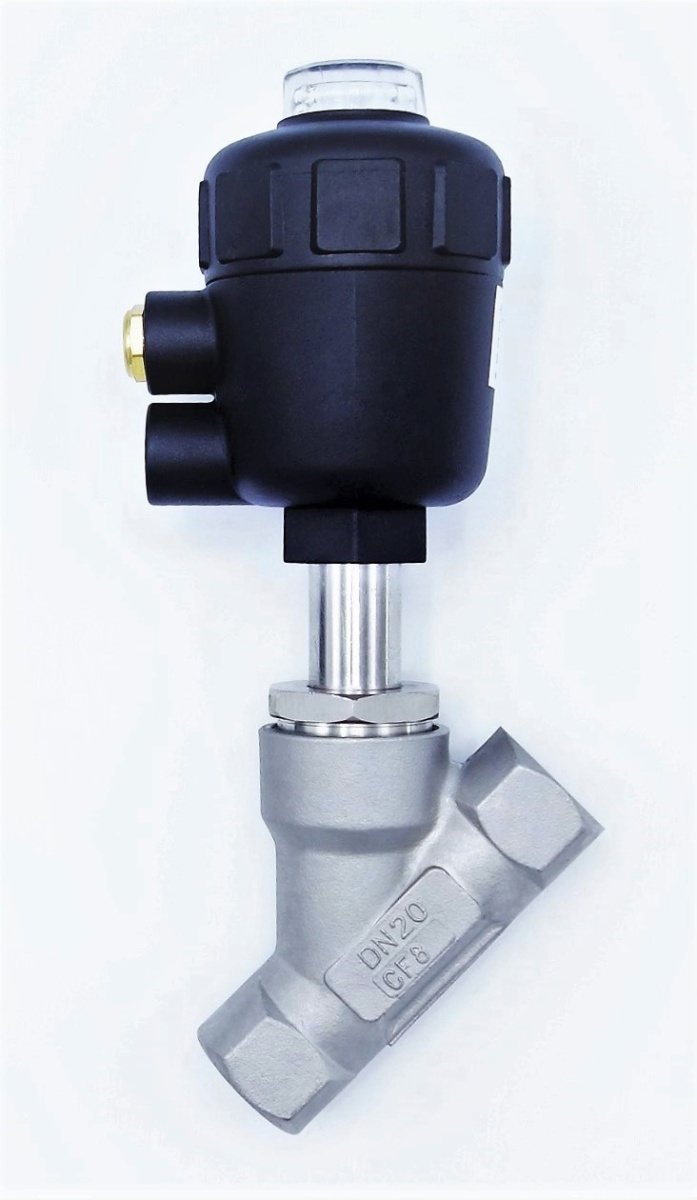 Pneumaticky ovládaný ventil se šikmým sedlem-45°, G-závit, materiál těsnění PPS