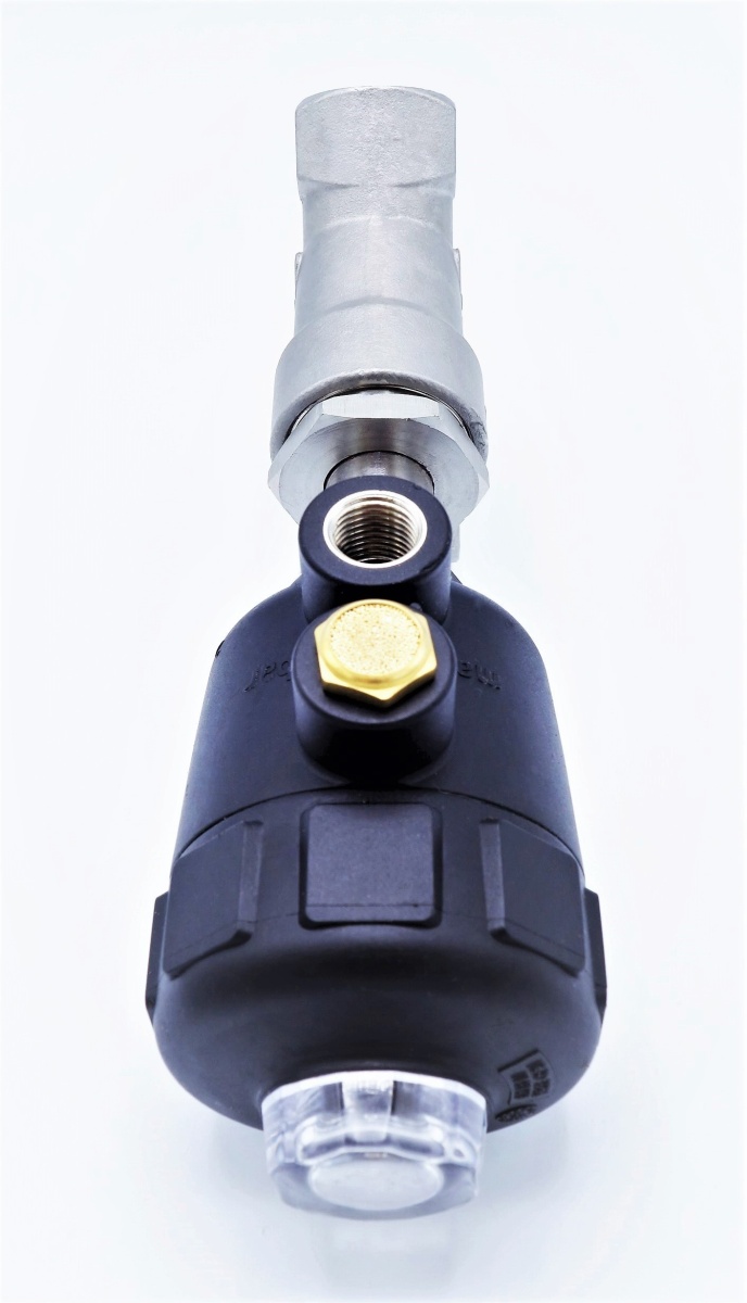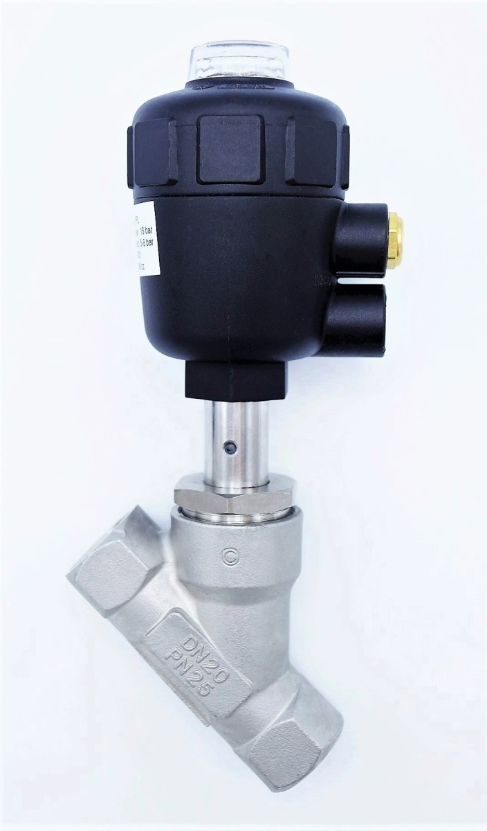 Pneumaticky ovládaný ventil se šikmým sedlem-45°, G-závit, materiál těsnění PPS