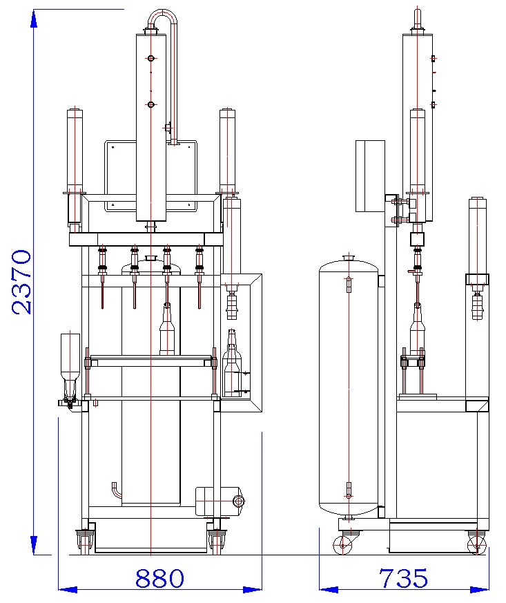 - Následně obsluha odebere láhve a umístí je na stůl pod plnící jehly (dle velikosti láhve je možné nastavit výšku stolu pod plnícími jehlami, toto nastavení provede obsluha v návaznosti na výšku láhve tak, aby plnící jehla plně dosedala na láhev - nastavení stolu se provede manuálně).