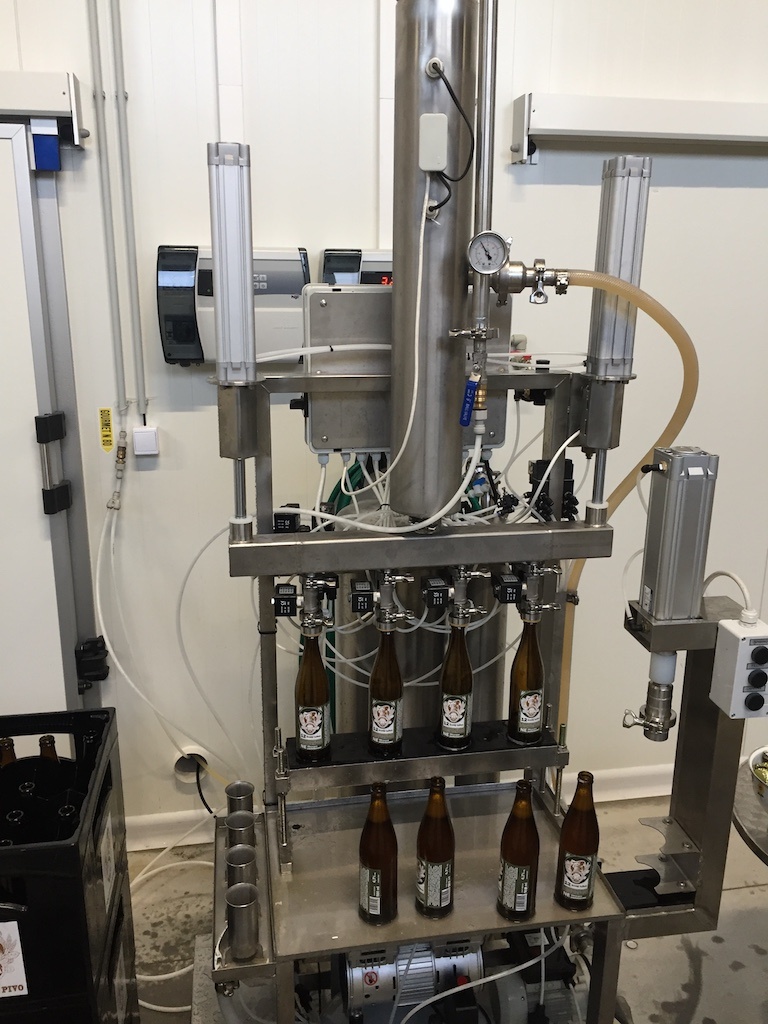 - Následně obsluha láhve odebere, položí je na odkládací stůl a ty jsou následně zazátkovány korunkovými uzávěry na pneumatické zátkovací hlavně.