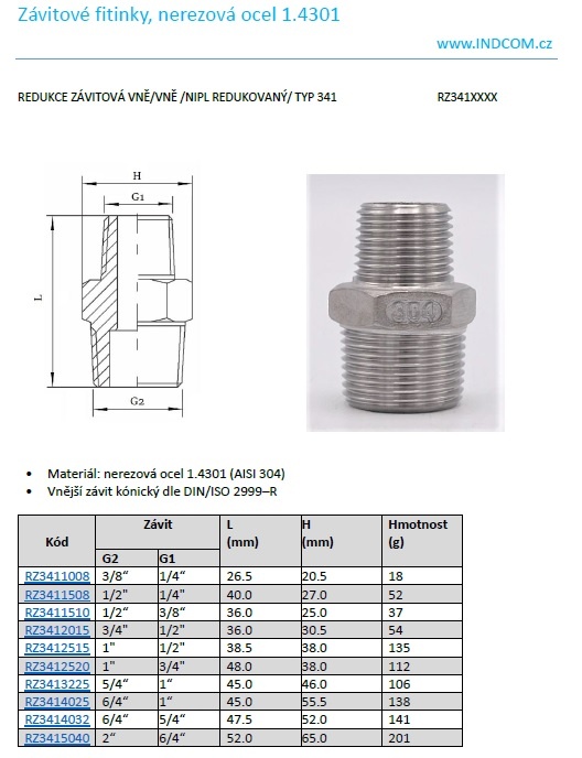 Redukce závitová VNĚ/VNĚ /nipl redukovaný/ typ 341
