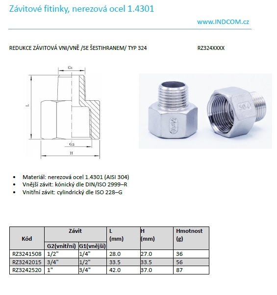 Redukce závitová VNI/VNĚ /se šestihranem/ typ 324