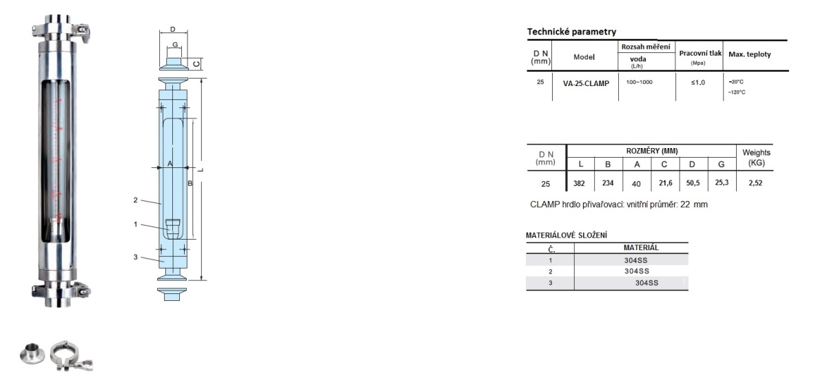 - Připojení: clamp DN25 - límeček 50,5 mm, vnitřní průměr 22 mm
