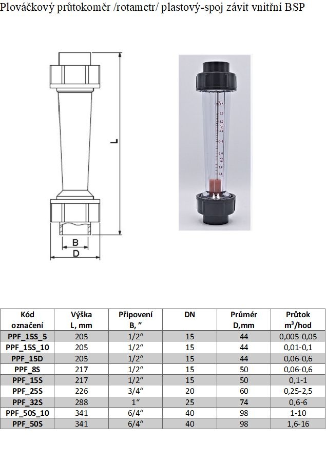 Plováčkový průtokoměr /rotametr/ plastový-spoj závit vnitřní BSP