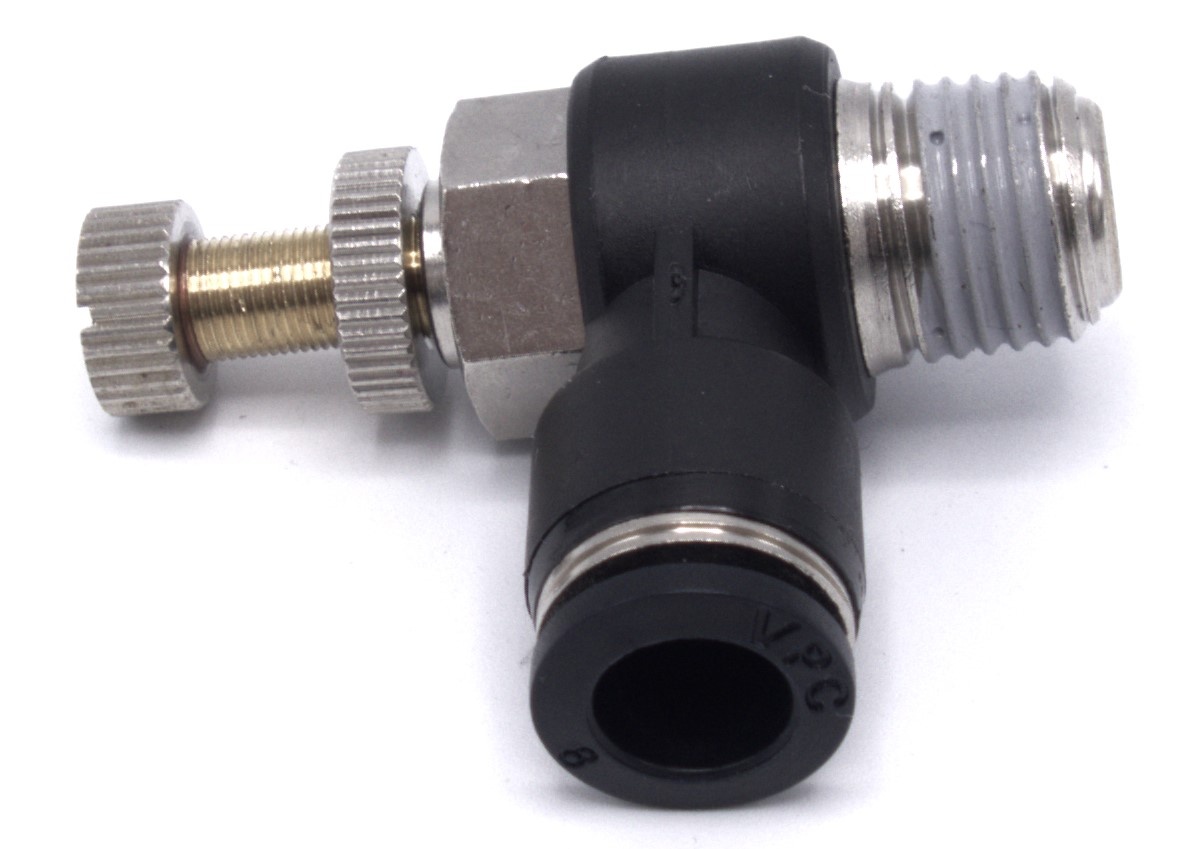Škrticí ventil jednosměrný, nástrčný, škrcení na výstupu, tvar L s kolečkem pro nastavení rukou
