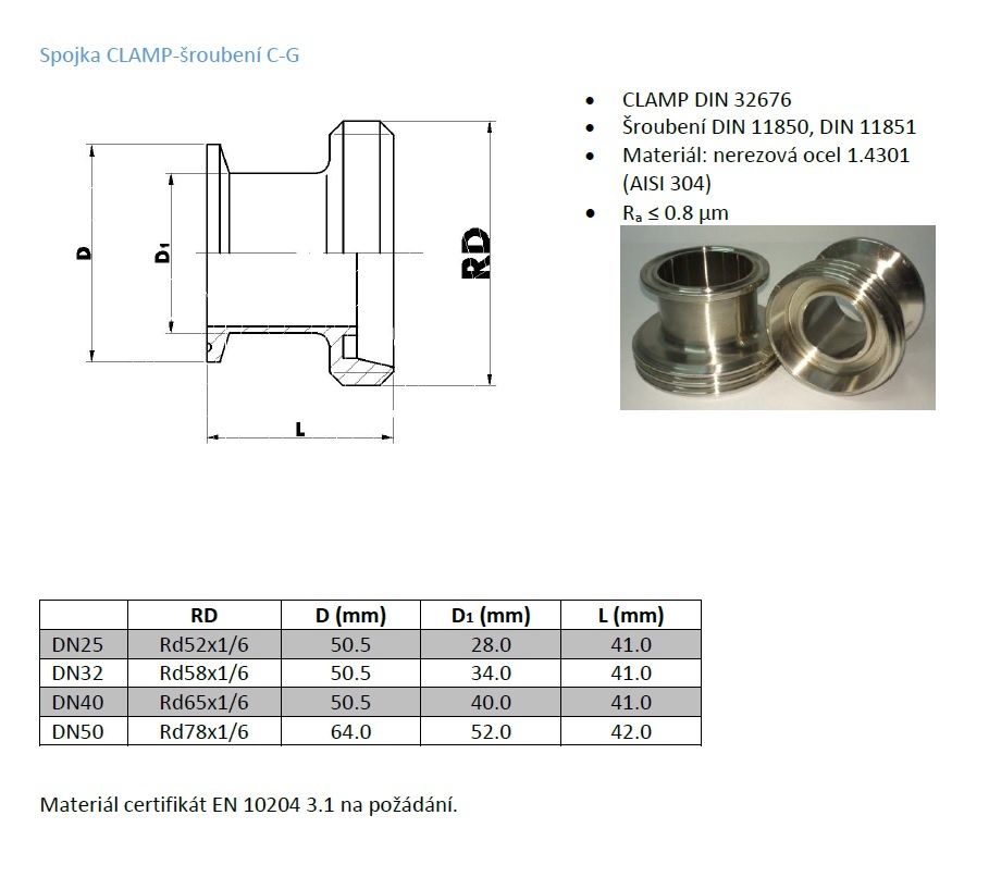- Clamp systém dle DIN 32676 slouží ke spojování potrubních dílů v hygienických procesech. Umožňuje rychlé, bezpečné a snadno rozebíratelné spojení hadic, trubek, armatur, ventilů nebo filtrů bez nutnosti nářadí. Používá se v prostředích, kde je požadována vysoká čistota a možnost časté demontáže (CIP/SIP procesy).