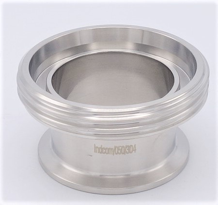 Spojka (neboli přechodka) mezi CLAMP připojením a potravinářským (mlékárenským) šroubením.