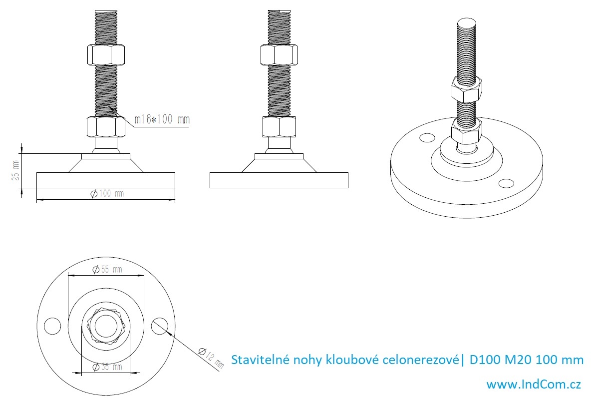 Stavitelné nohy kloubové celonerezové průměr podložky nohy 100 mm, šroubovice M20, délka šroubovice 100 mm.
