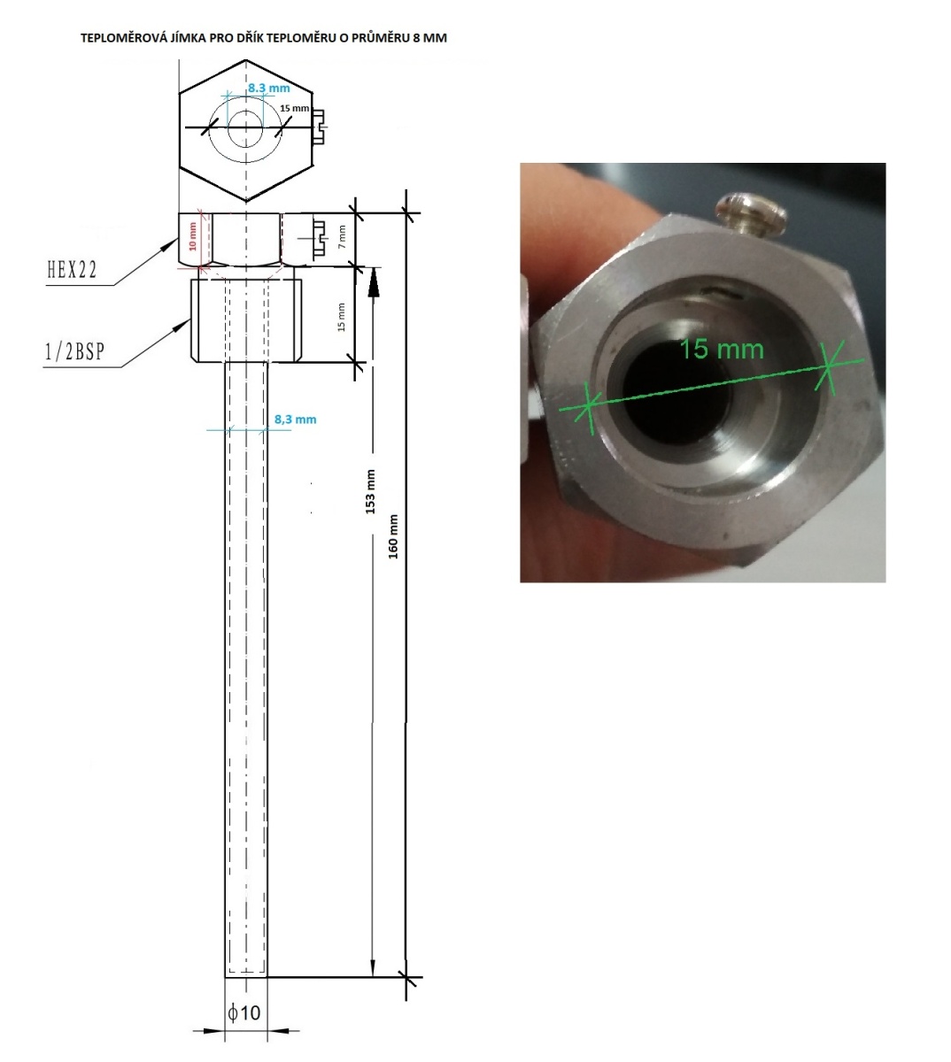 • tl. stěny 0,8 mm, vnitřní průměr 8.3 mm (pro dřík teploměru o průměru 8 mm)