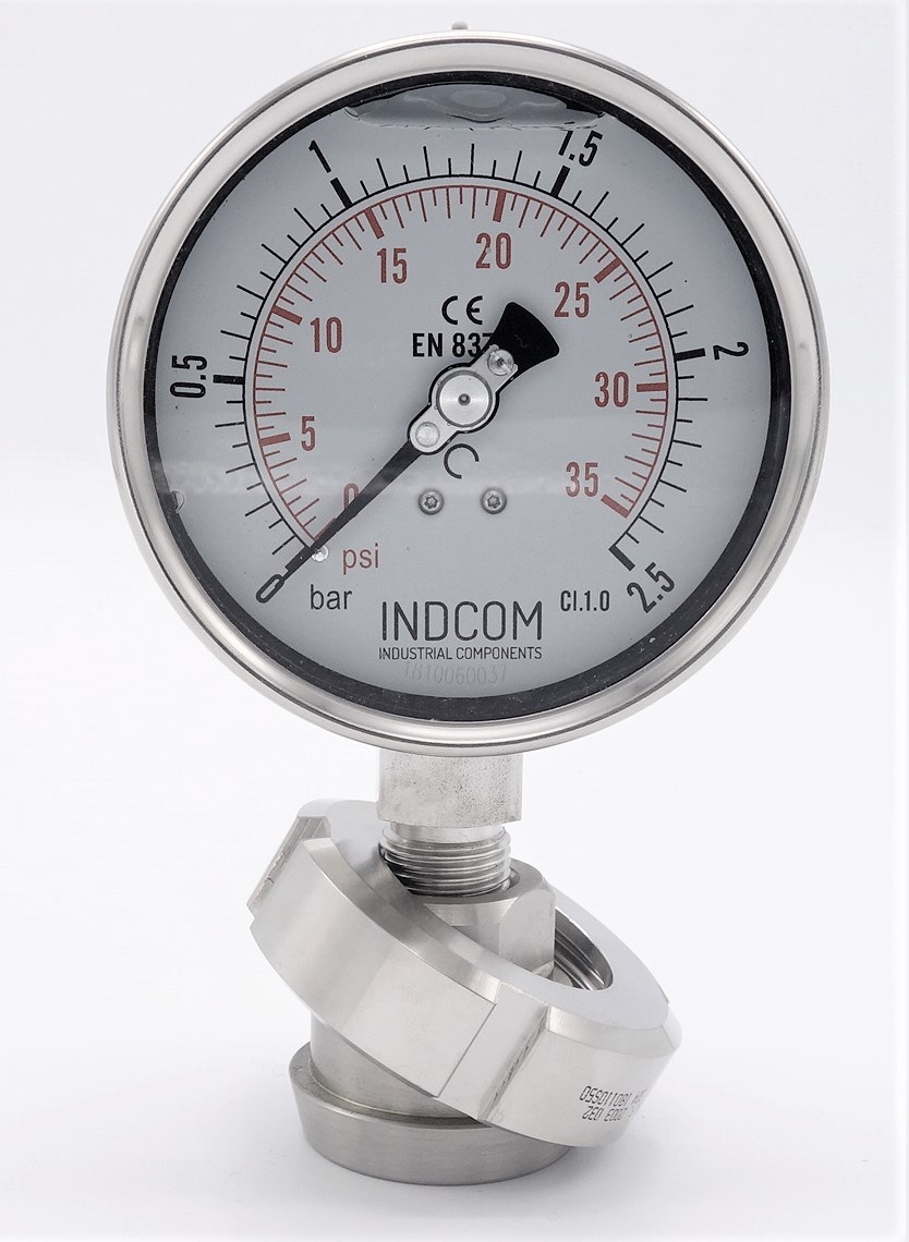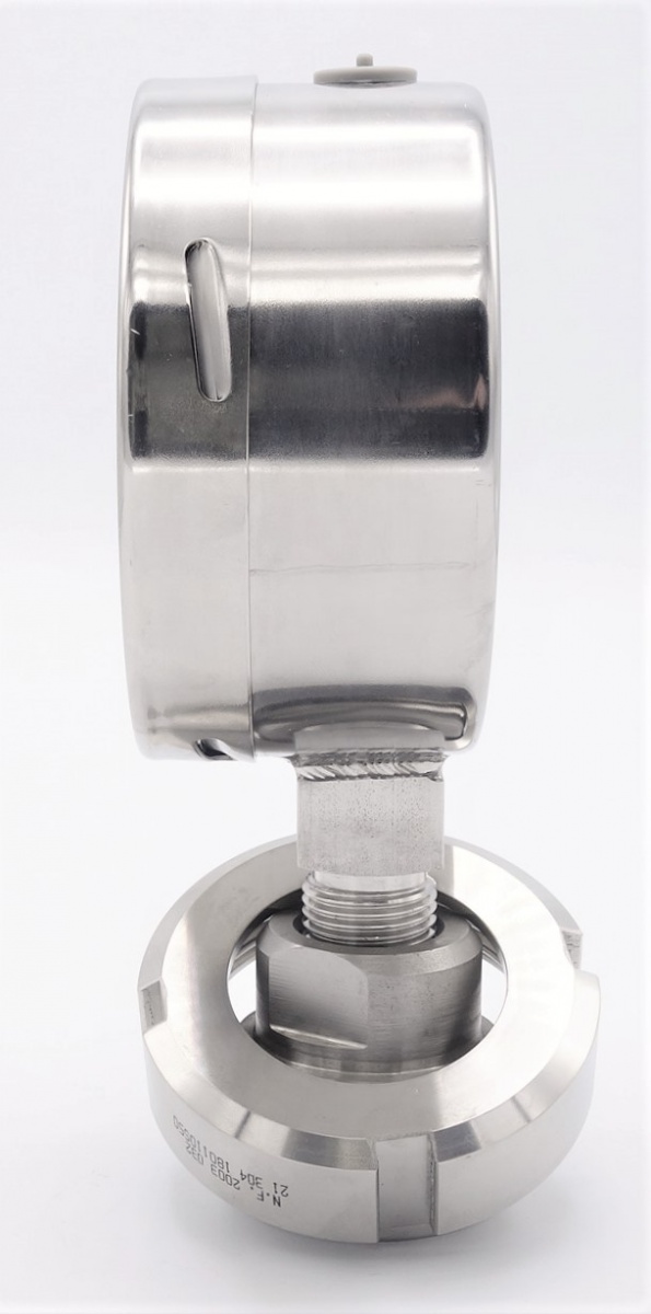 Tlakoměr s oddělovací membránou, potravinářské šroubení DIN 11851, číselník 100 mm,matice DN32