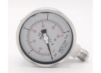 - Tlakoměr je vyroben z nerezové oceli materiál pouzdra AISI 304, materiál závitu AISI 316. Snímacím zařízení je Bourdonova nerezová pružina.
