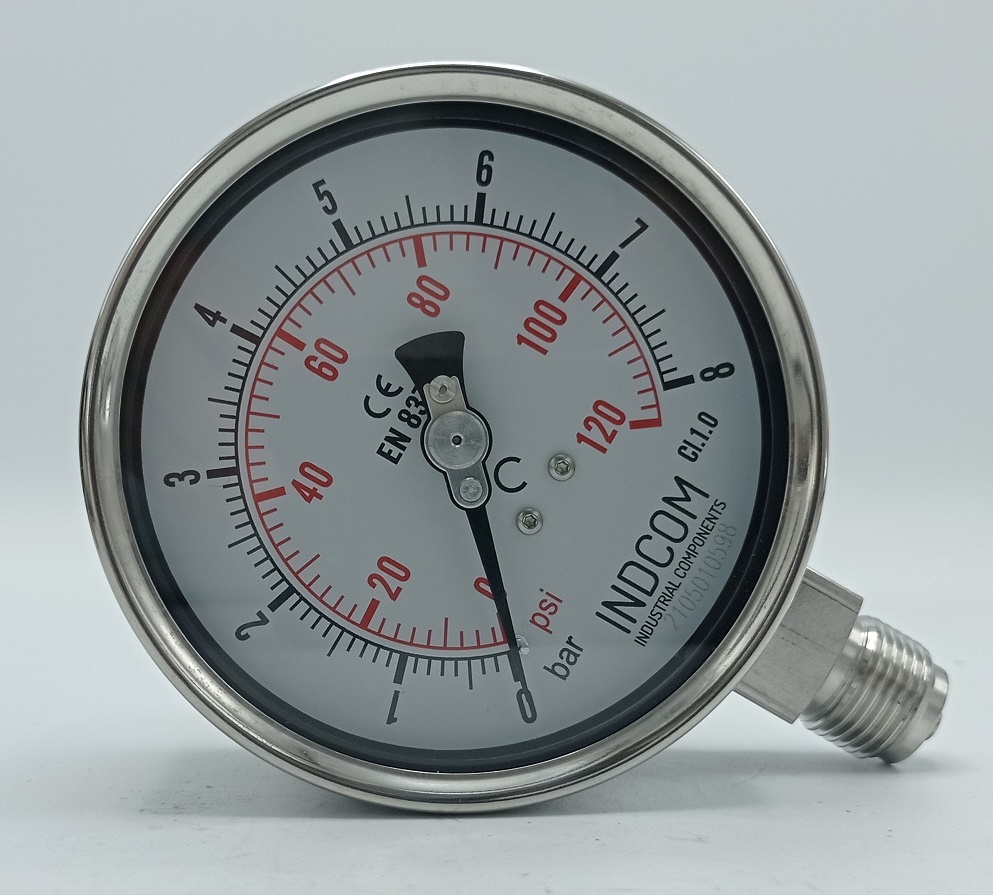 • Tlakoměr je vyroben z nerezové oceli materiál pouzdra AISI 304, materiál závitu AISI 316. Snímacím zařízení je Bourdonova nerezová pružina.