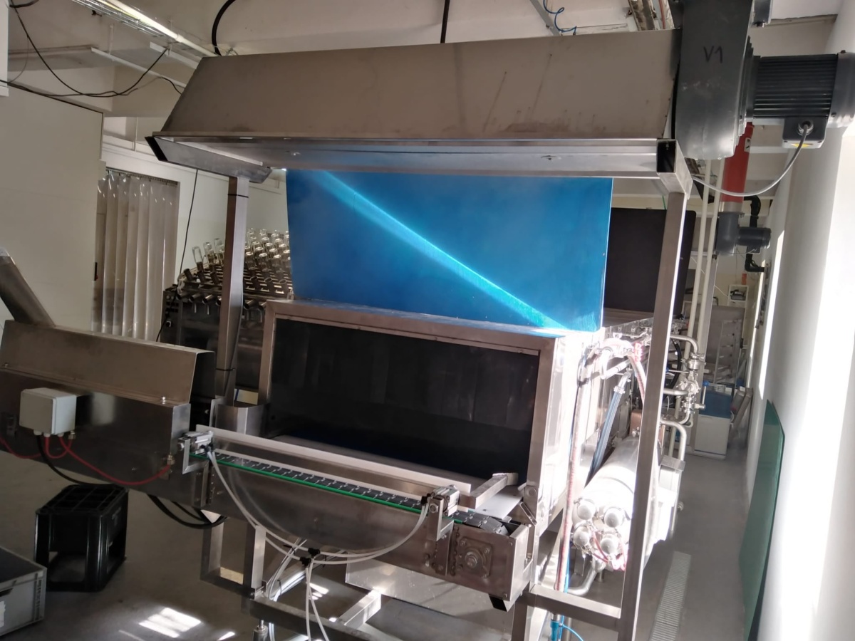 Pasterizační tunel s režimem předehřev, pasterizace, chlazení, nastavení rychlosti posunu dopravníku, regulace teploty pasterizace, rekuperace energií, ohřev přes deskové výměníky